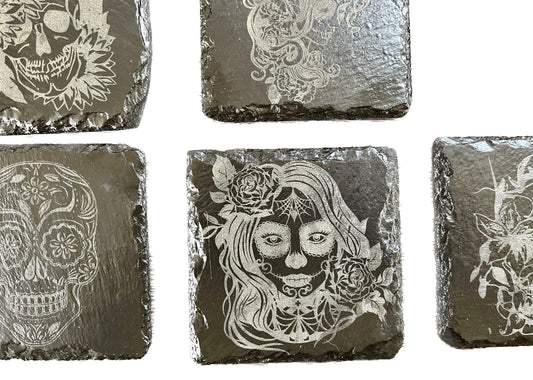 Set of 6 Sugar Skulls laser engraved slate coasters